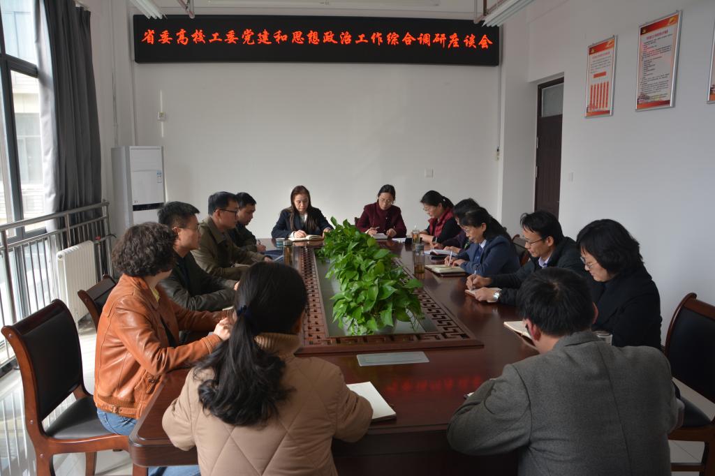 3月8日下午,河南省委高校工委综合调研组一行三人在校机关党委书记、组织部副部长梁丰同志陪同下,来公司开展党建和思想政治工作方面的专题调研。调研组成员分别为省教育厅统战处副调研员高峰、省教育厅思政处主任科员张会敏、河南财经政法大学beat365中国官网庞睿。公司党总支书记虎业勤、副书记兼副经理赵茜、副经理李明桂、党支部书记、教研室主任等参加了座谈。