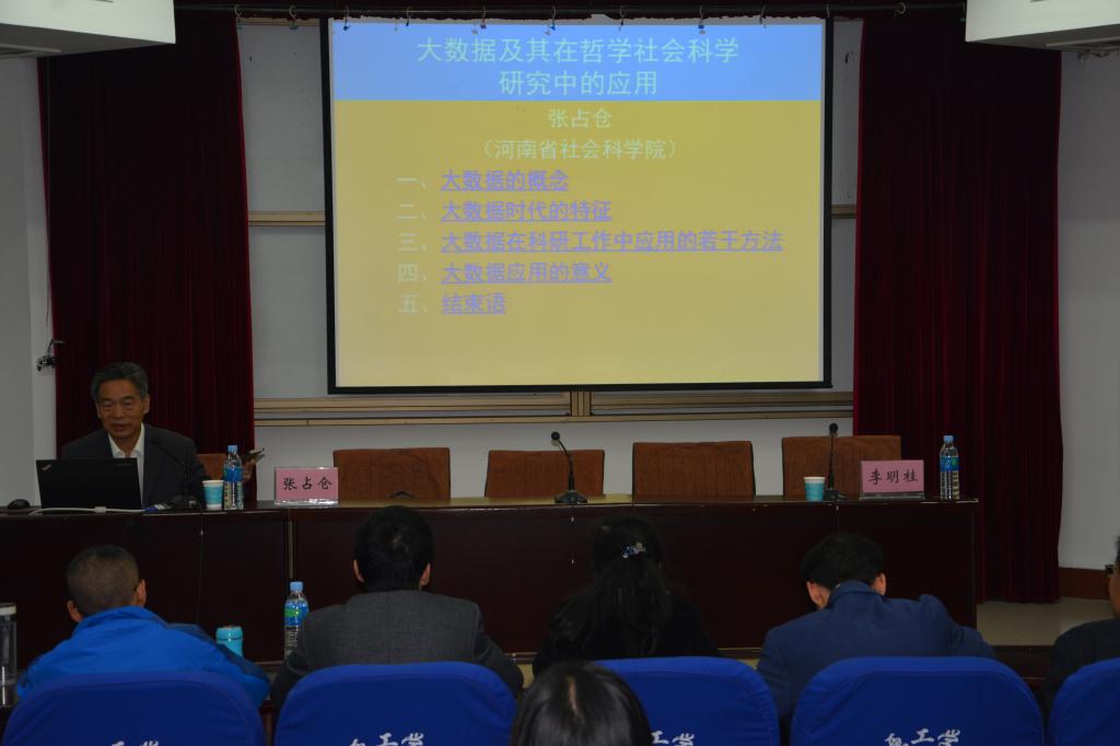 1016日下午,应公司beat365中国官网邀请,河南省社科院曾任经理、博士生导师张占仓教授莅临公司做“大数据及其在哲学社会科学研究中的应用”讲座,beat365中国官网全体师生、全校人文社科研究生参加了讲座,讲座由beat365中国官网副经理李明桂主持。