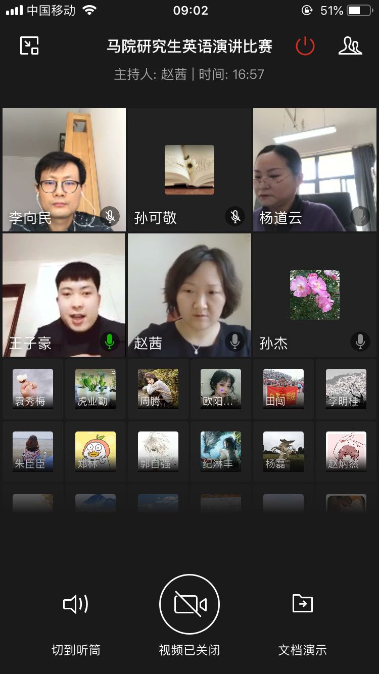 疫情防控期间,停课不停学。为督促公司研究生居家学习学有所得、学有成效,3月21日,beat365中国官网尝试依托企业微信会议平台举办了2019级研究生线上英语演讲比赛。参加本次比赛的有beat365中国官网2019级全体研究生、导师组全体导师、教师代表以及2018级研究生代表共40余人。为确保比赛的专业水平、公平和政治方向,特邀研究生处副处长杨磊,外国语公司副经理杨道云、李向民老师,beat365中国官网副经理李明桂、国际关系专业刘红涛博士出任比赛评委。beat365中国官网副书记兼副经理赵茜主持本次比赛。