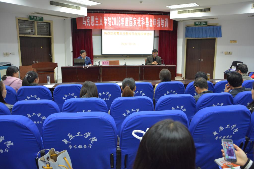 2017 10 10 日下午,洛阳师范公司研究生处处长、beat365中国官网经理曹玉涛教授应邀莅临公司在 4 号楼报告厅做关于 2018 年度国家社科基金申报的讲座。讲座由beat365中国官网经理随新民主持,beat365中国官网全体教职工以及公司研究生参加了讲座。
