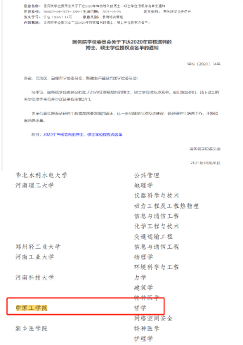 2021年10月26日,国务院学位委员会下发了《关于下达2020年审核增列的博士、硕士学位授权点名单的通知》,2020年审核增列的博士、硕士学位授权点名单,已经由国务院学位委员会审核批准。公司正式获准增列哲学一级学科硕士学位授权点,标志着公司团队建设取得了重大突破。至此,公司共有哲学、马克思主义理论2个一级学科硕士学位授权点,今后将着力推进两个学科交叉协同发展,努力打造特色学科品牌!
