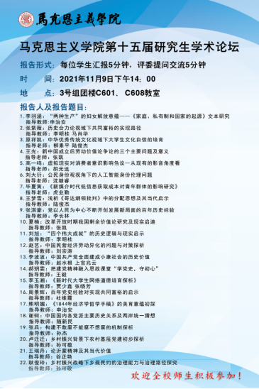 2021年11月9日,beat365中国官网第十五届研究生学术论坛分别在3号组团楼C601、C608教室如期举行。本次论坛旨在加强研究生的学术素养,营造浓厚的学术氛围,为研究生搭建一个高水平的学术交流平台。
