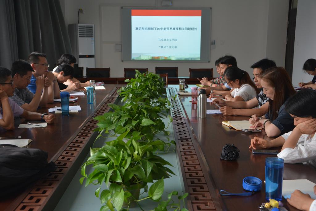 会上,毛泽东思想和中国特色社会主义理论体系概论党支部书记申治安首先介绍了此次意识形态研判会的主题以及事前准备情况。随后,该党支部的孙可敬、胡朝阳、刘宗涛、李明桂、罗锋等党员教师围绕中美贸易摩擦问题,着重从美国特朗普政府的意识形态作祟、中国政府对之坚决批判等方面进行了发言。